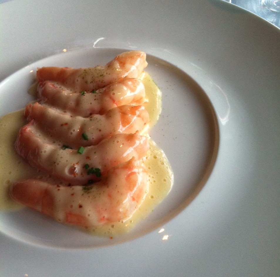 Then the Canlis Prawns, the Pear Arugula Salad and then a cup of the roasted cauliflower cheddar soup. Going to end with Pirouette cookies to dip into salted Carmel whipped cream & a little chocolate sauce on the side…….And some fabulous champagne of course.