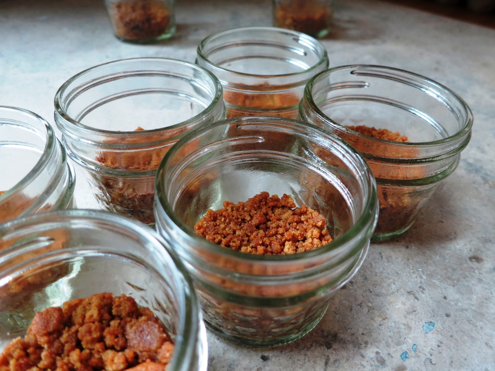 Don’t let the curry scare you. It is the secret ingredient that takes this dessert to a whole new level. You just want a hint of it, but you’ll be amazed with how it changes the whole dish. For the competition I made these in individual silicone molds. While these make for a more formal presentation, 4 oz glass jars are also lovely and more portable. If making and serving in the jars, grease well, and then put the crust in first.