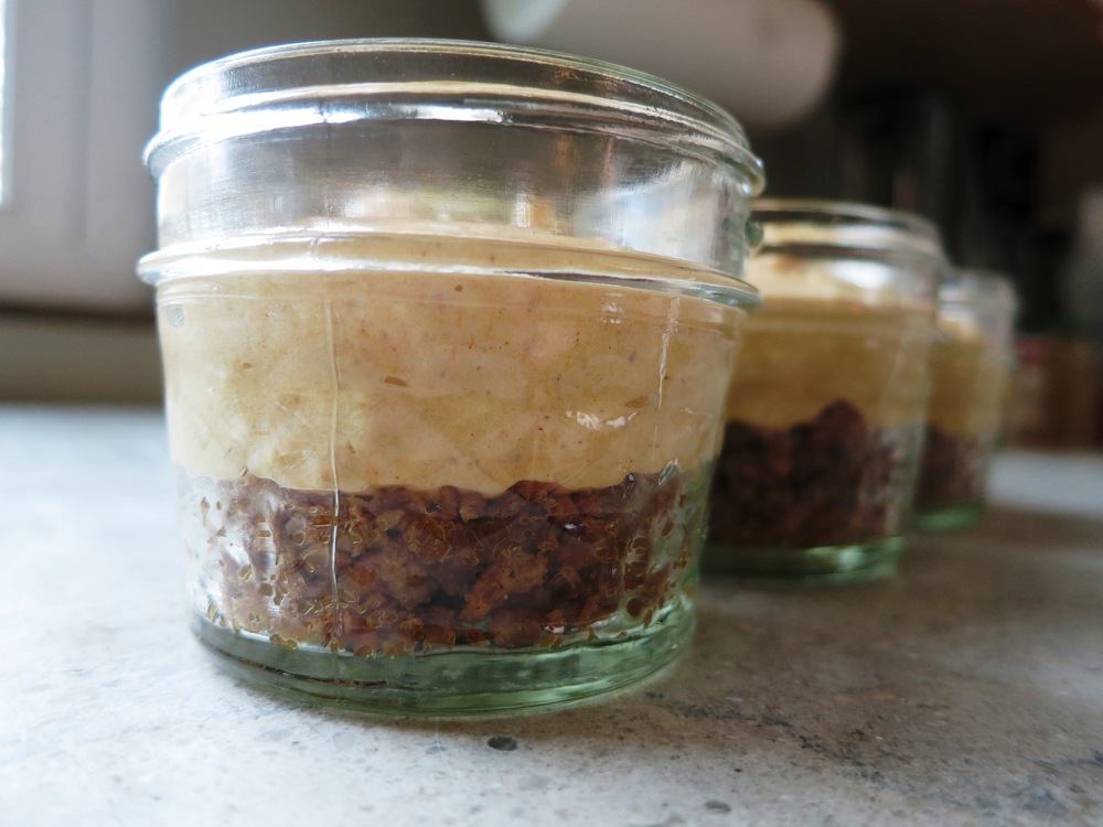 Adding the cheesecake to the jars. Allow about 1/2″ room at the top for the later added whipped cream.