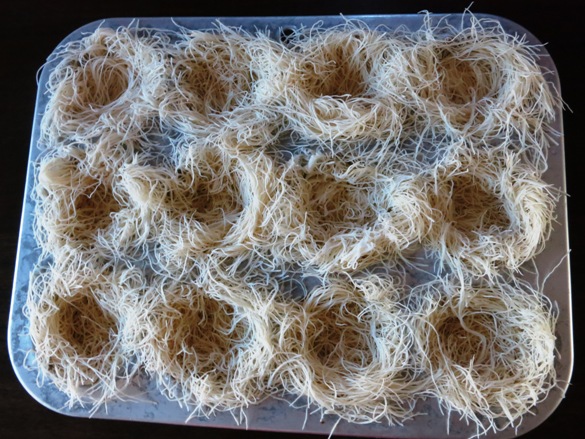 - Meanwhile, in greased muffin tins, put a bundle of kataifi into each and make into a little nest. Brush with melted butter.