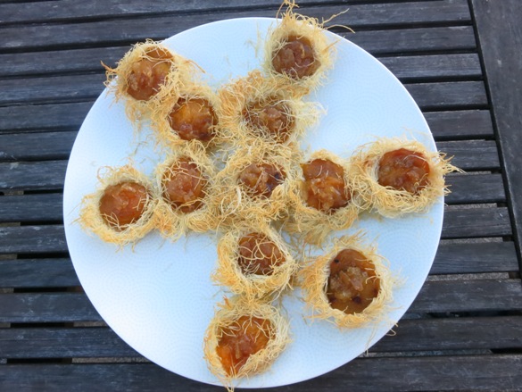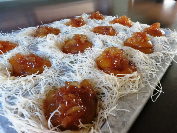 It’s a Middle Eastern cheesecake called konafe – not on my blog, but as I’m writing I’m wondering why I’ve neglected to share this amazing treat. I think December is the month! The shredded phyllo is layered with a mix of fresh mozzarella and ricotta and then a sweet syrup is poured over it while still warm from the oven. Really divine!