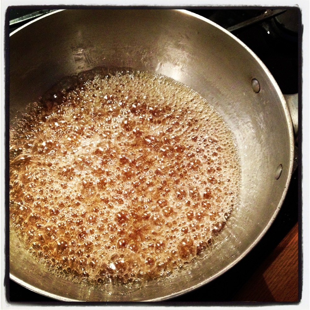 - In a heavy bottomed medium saucepan over medium-high heat, combine the sugar and water. Stir with a wooden spoon. Bring to a boil and shake/swirl very often, but don’t stir, until it turns a medium amber color (about 15 minutes). You want it to be boiling, but if it smells like it’s burning turn it down just every so slightly while still maintaining the boil. The shaking and swirling will cause sugar to crystallize on the side. Be judicious in constantly brushing it down into the mixture with a pastry brush so that it doesn’t harden, which can ruin your batch.