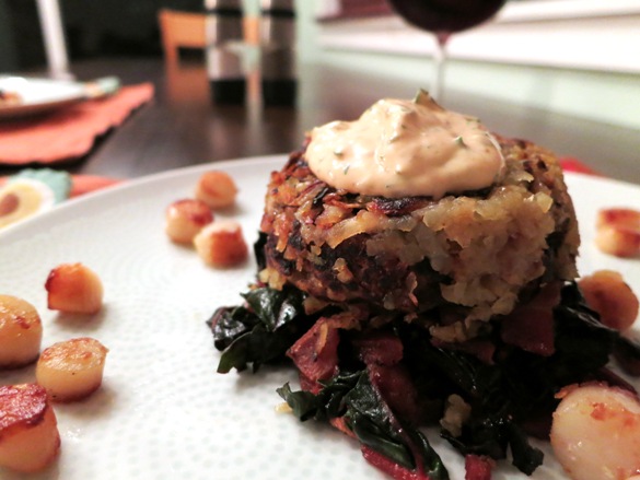 - To plate, divide the greens and bacon among two plates, using a 1/2 cup metal measuring cup, tightly pack half the hash, and then flip onto the greens, scatter half the scallops, and finish with a Spicy Remoulade.