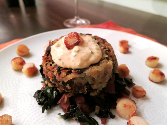 Sweet Potato Hash served on a Bed of Winter Greens with Pancetta and Finished with Caramelized Scallops and a Spicy Remoulade