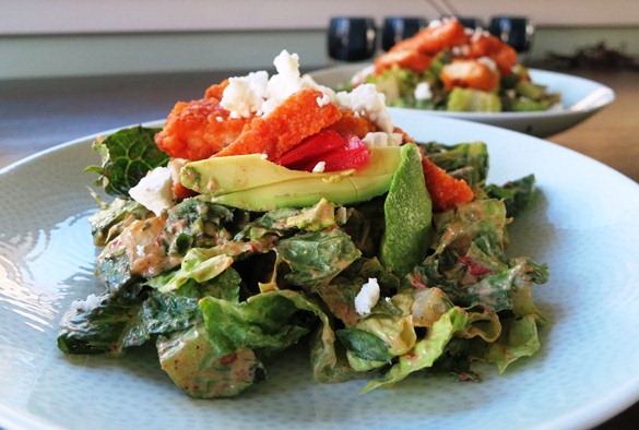 Buffalo Chicken Salad with Chipotle Dressing, Avocado, and Goat Cheese