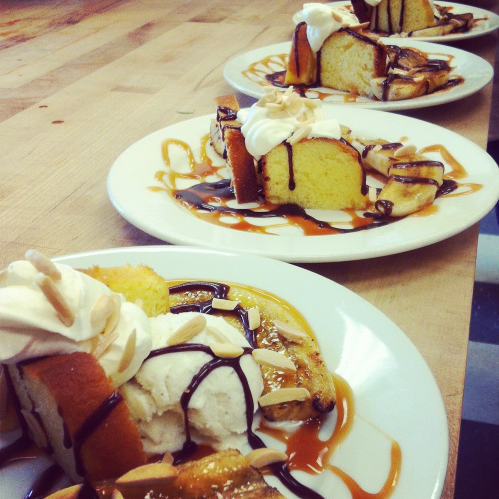 Caramelized Bananas with Salted Caramel Sauce, Served over Toasted Pound Cake and Ice Cream and finished with Slivered Almonds