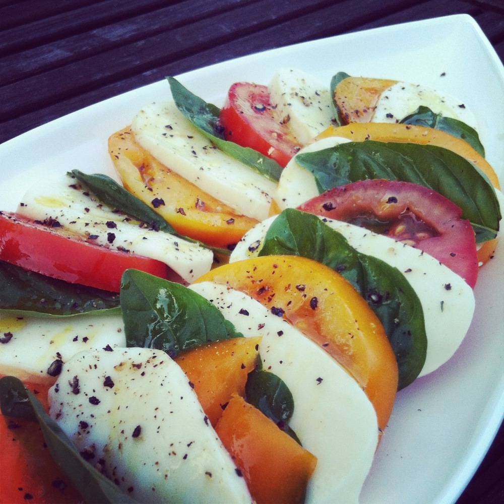 One of my favorite Summer Salads: Mozzarella, Basil, and Heirloom Tomatoes, Drizzled with Olive Oil and Finished with Salt and Pepper