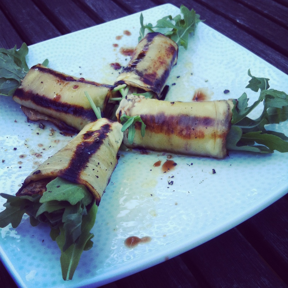 Grilled Eggplant Carpaccio, Stuffed with Fontina and Arugula and Drizzled with Arbequina Olive Oil and Balsamic Vinegar